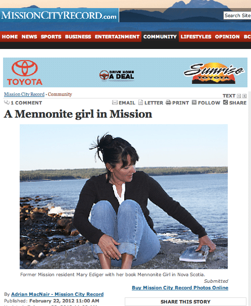 Posted: February 23, 2012 Filed under: Bryler Publications, Mennonite literature, Mennonite Memoir, Welcome Inn | Tags: teacher Leave a commentThe lovely folks at Mission City Record have written a little feature on myself and my book, “Mennonite Girl”. Click here or the image below to read what they had to say!